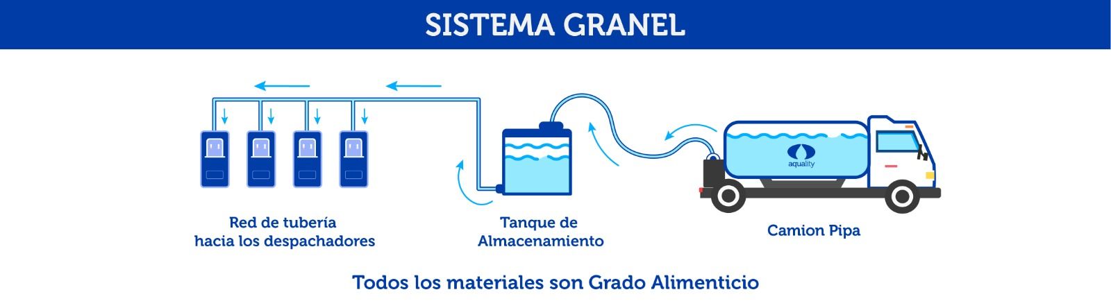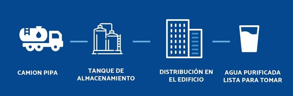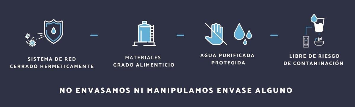 Nuestro sistema no es por gravedad, y manejamos conservadores en el agua que garantizan su calidad en los tanques de almacenamiento, así como en la línea de distribución. Para esto utilizamos filtros de carbón activado en cada una de las salidas.